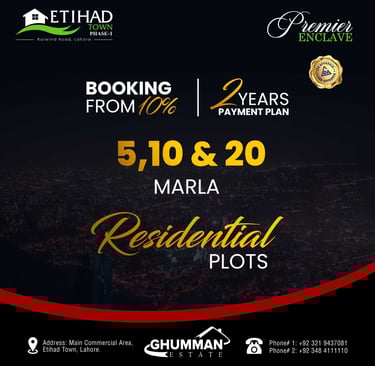 Ghumman Estate is a trusted and authorized dealer in Etihad Town, offering sales and purchases in Etihad Town Phase 1 (Raiwind Road) and Etihad Town Phase 2 (Jia Bagga Road).